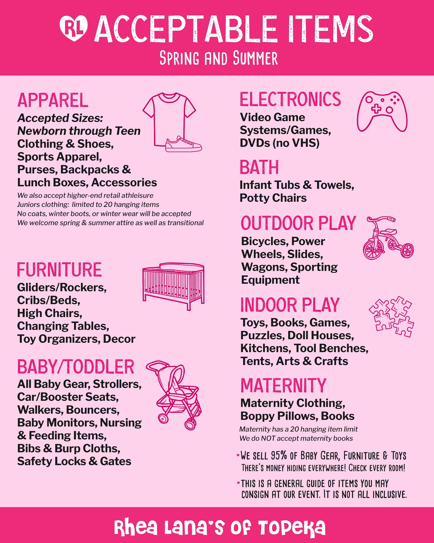 Newborn to teen size clothing and shoes. For the Spring/Summer sale, we will accept short sleeves, tank tops, long sleeve (no fall themes), shorts, jeans, swimsuits, light jackets, Easter outfits, 4th of July outfits, and other spring/summer themed outfits. Don't forget dance and sports gear! You can also sell tennis shoes, sandals, flip flops and dress shoes,cowboy/girl boots and rain boots. We also accept books, small and large toys, plush/stuffed animals (must be name brand such as Disney, Build-A-Bear, Squishmallows, etc), baby equipment, furniture, sports equipment, video games, outdoor toys, accessories (bows, purses, backpacks, lunch boxes, hats), and decor intended for a child's room.